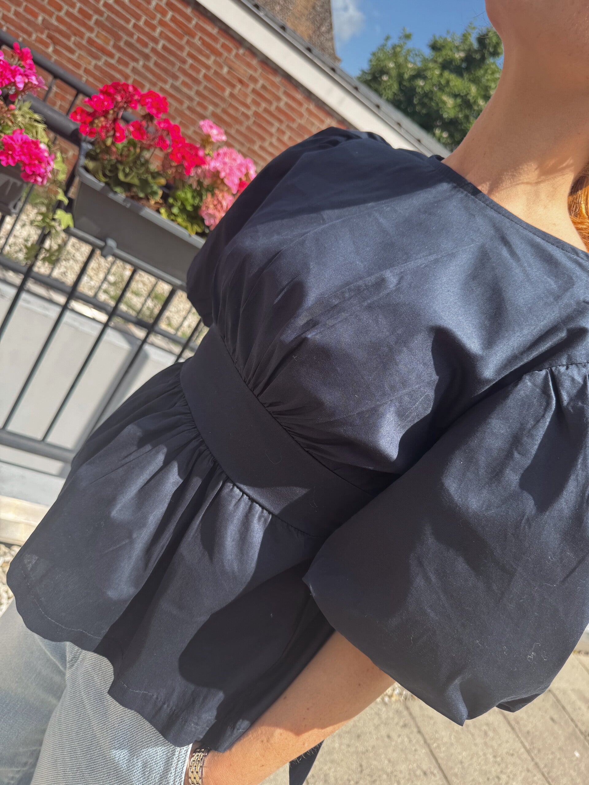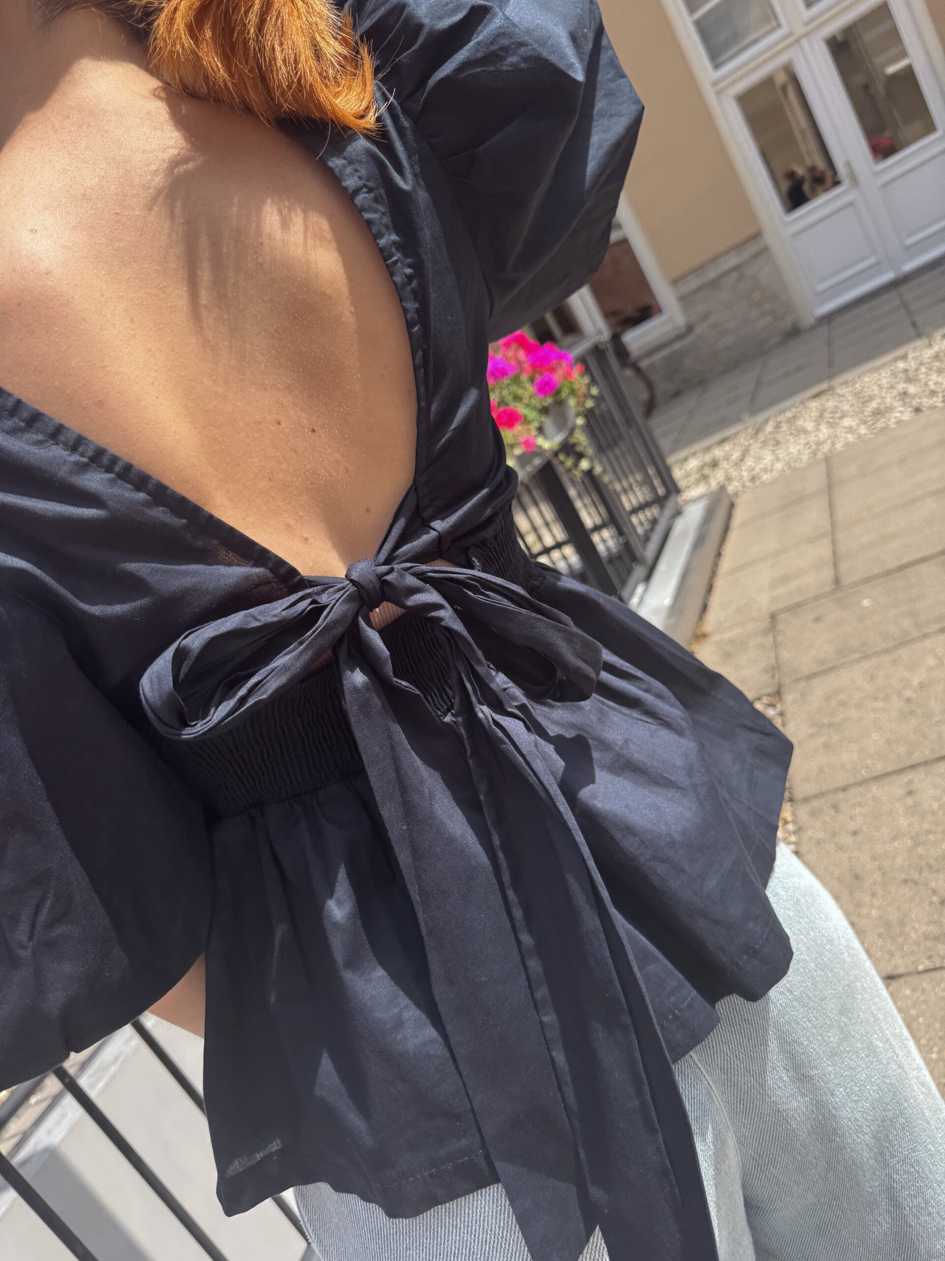 Prachtige blouse met pofmouwen en een strik aan de achterkant. Leuk voor casual of een feestje.